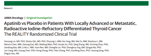 2021年12月16日,权威医学杂志《JAMA Oncology》(影响因子31.777)在线发表阿帕替尼的一项III期临床研究(REALITY)——甲磺酸阿帕替尼片治疗局部进展/转移性放射性碘难治性分化型甲状腺癌(RAIR-DTC)患者的多中心、随机、双盲、安慰剂对照临床研究。此研究由北京协和医院的林岩松教授和南京金陵医院的秦叔逵教授发起,在全国21个研究中心展开,由利来国际w66医药中央医学事务部团队支持完成。